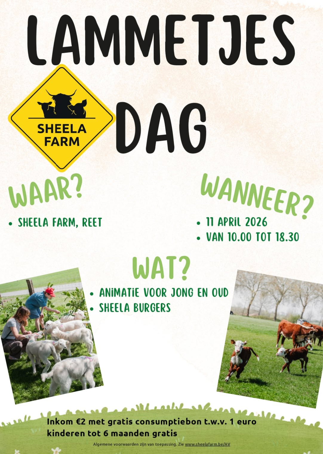 Op zaterdag 11 april 2026 is het Lammetjesdag bij Sheela Farms! Ga tussen 10.00 en 18.30 uur gezellig langs en geniet van een dag vol lenteplezier.