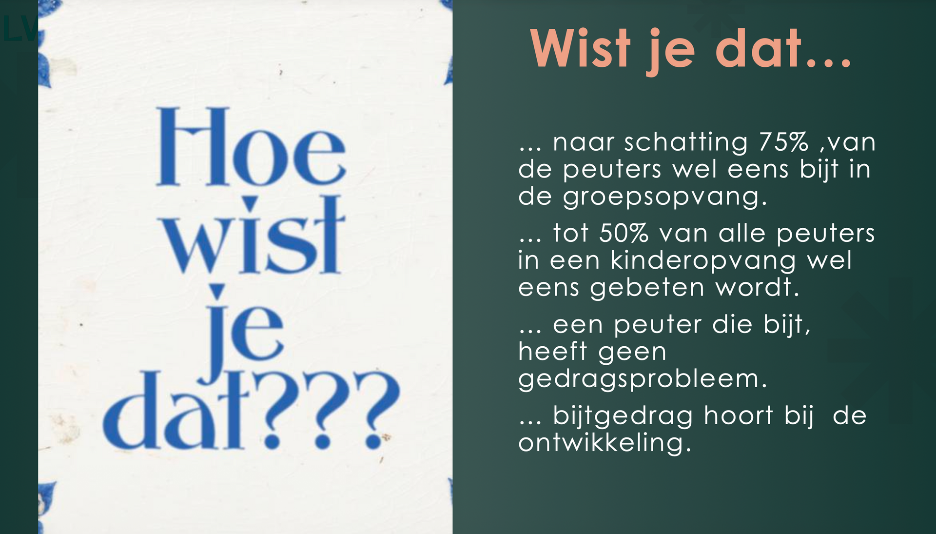 Ons team heeft recent een opleidingsdag rond bijtgedrag bij jonge kinderen gevolgd. Tijdens deze opleiding hebben we stilgestaan bij de verschillende redenen waarom kinderen soms bijten en hoe dit kadert binnen hun ontwikkeling.