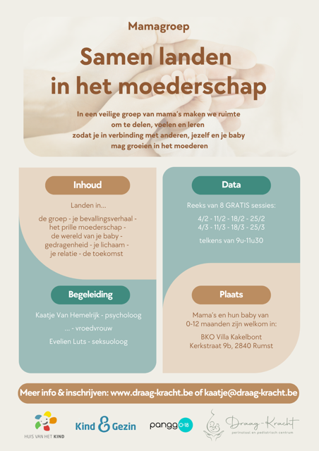 In een warme en veilige groep ontmoeten mama’s van baby’s (0–12 maanden) elkaar om ervaringen te delen, steun te vinden en te groeien in hun nieuwe rol. Elke reeks bestaat uit 8 gratis sessies waarin we ruimte maken om te voelen, leren en verbinden – met jezelf, je baby en andere mama’s.